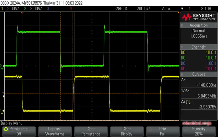 The difference between an edge on the input and the edge appearing on the output (time between the dotted vertical “cursor” lines) is 148ns. Light travels at 3e8m/s, so would take 17ns to travel down the 5m cable. The remaining 131ns of the 148ns must be due to processing delays in the TOSLINK transceiver and receiver. Time delays of the oscilloscope probes is small and consistent for both input and output, so should have a negligible effect on this measurement.