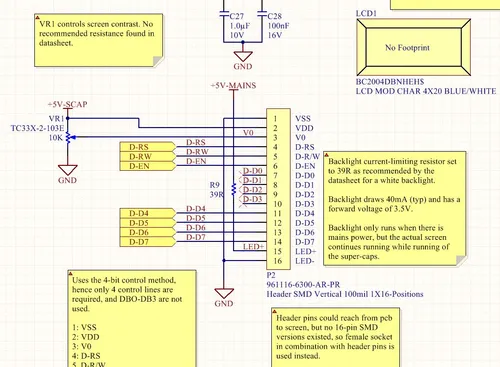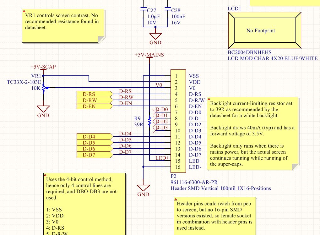LCD screens are typically use 8-bit interfaces which can usually support a reduced pin-count 4-bit mode. The following schematic shows how a typical character LCD screen is connected when using four-bit mode. The 7 lines D-RS, D-R/W, D-EN and D-D4 through D-D7 are connected to a microcontroller or similar interface. The contrast of the screen is set by potentiometer VR1. Note that for a LCD requiring a negative contrast supply (the one shown is for a LCD with an internal negative-voltage generator), VR1 is connected differently with the pin connected to +5V-SCAP instead connected to a negative supply (typically between -2 and -3V).