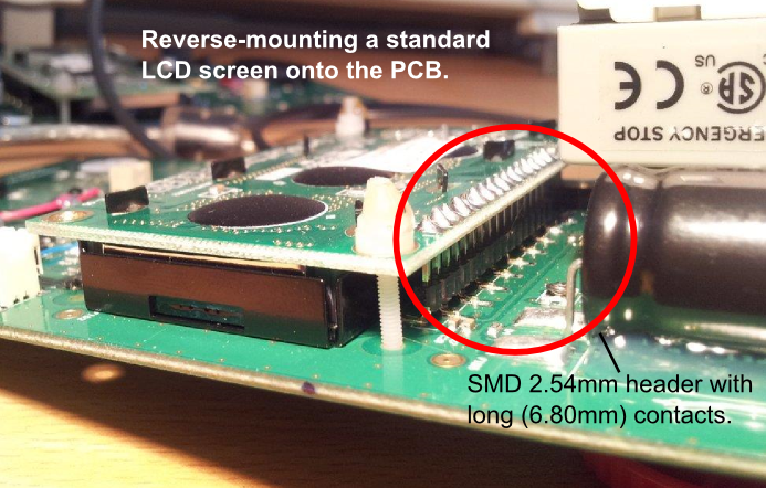 The following image shows how you can reverse mount an LCD screen onto a PCB directly (using the PCB as the front panel).