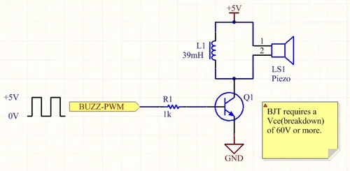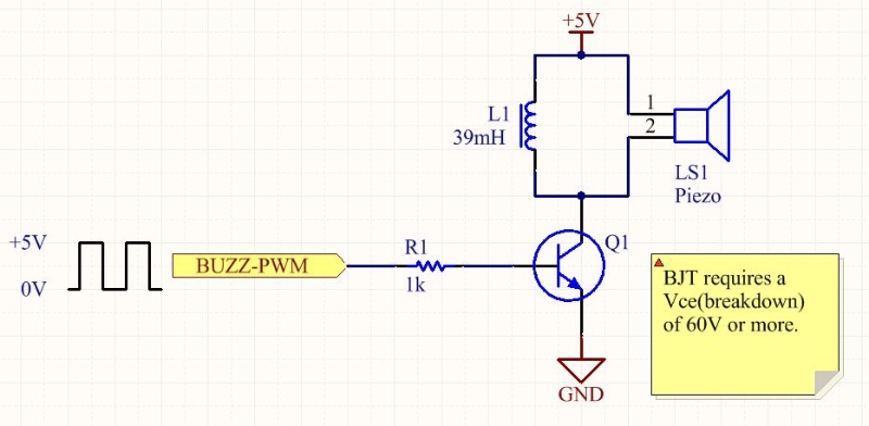 When the NPN BJT is switched on, the current builds up through the inductor and energy is stored in it’s magnetic field. When the transistor is switched off, the inductor creates a large voltage spike which excites the piezo speaker. The piezo can be driven to around 40-60V with a 5V supply. Make sure the BJT has a collector-emitter breakdown voltage high enough to withstand this!