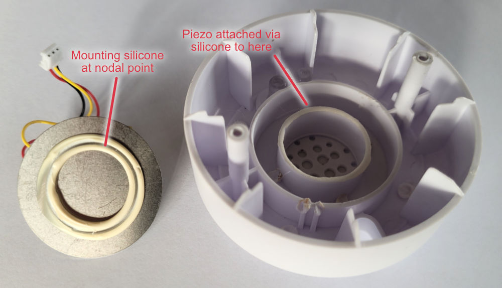 These un-mounted piezos have to be mounted on something, and consideration about the vibrational aspects of the piezo have to be taken into account. Obviously, if you glue the entire piezo to the mounting surface, it won’t be able to vibrate, and you’ll get no sound. There are two standard ways of mounting a piezo, and they are called either edge-mounting or nodal-mounting.