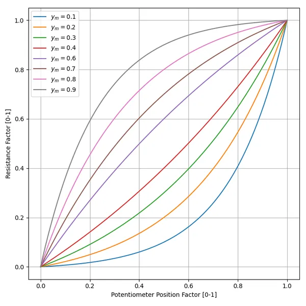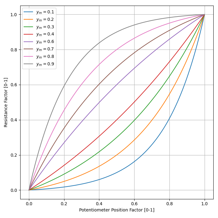 The below graph shows the shape of the potentiometers response for different values of , starting at and ending with .