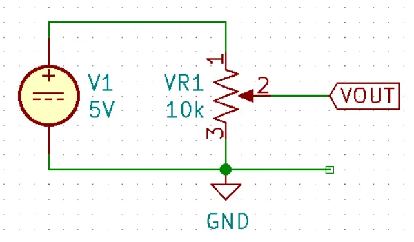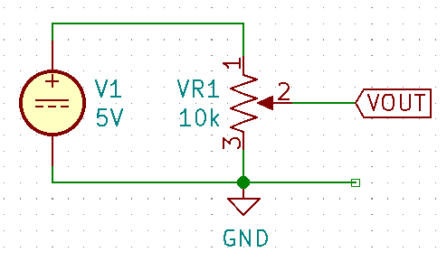 The most common use for a potentiometer to provide a variable output voltage based on how the far the potentiometer has been turned. This voltage then can be used to control any number of things, such as the volume of music as the user turns the volume dial. The two ends of the potentiometer are connected across a constant voltage source, in the example below, this is . The wiper then forms the variable mid-point of a voltage divider. As you turn the potentiometer, one of the “resistors” increases while the other decreases, and thus the wiper varies in voltage from one end point to the other. In the example below the wiper voltage varies from to :