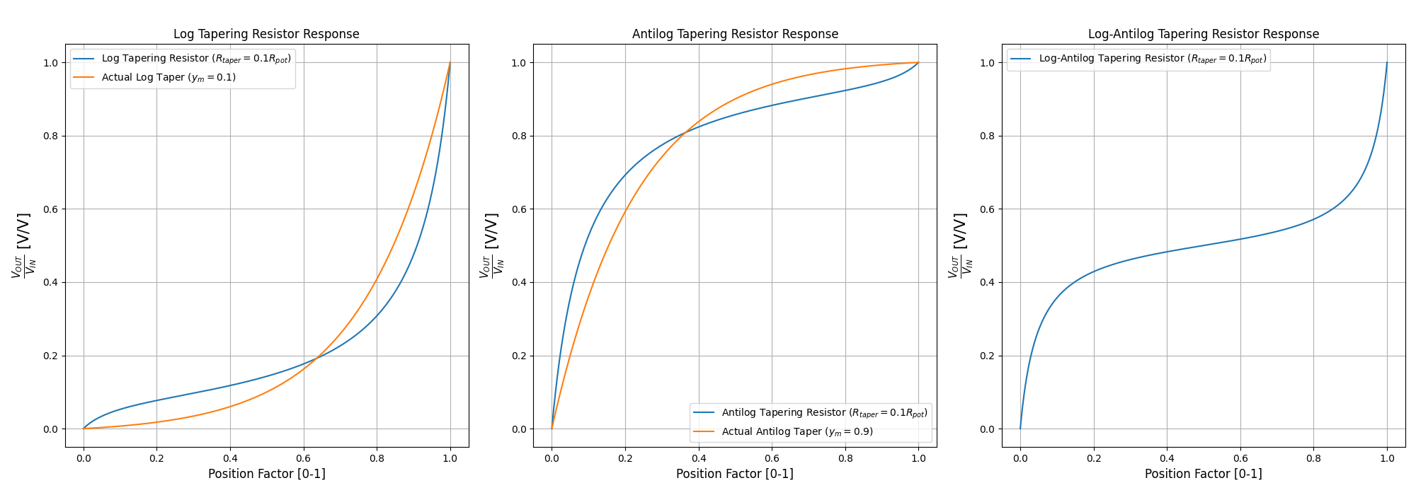 How do we choose the value of ? A good rule-of-thumb is to pick a value which is about 10-20% of the potentiometers total resistance. For example, for a linear potentiometer, you would choose a tapering resistance of . The below graph shows the response of potentiometers with tapering resistors. The tapering resistor’s resistance is 10% of the potentiometers (e.g. if it was a pot, the tapering resistor would be ). In the case of the log-antilog circuit, both tapering resistors have a resistance of 10% . In the case of the log and antilog circuits, the responses are also compared to the “ideal” responses (see The Ideal Logarithmic Taper Equation Section for more on how this is calculated):