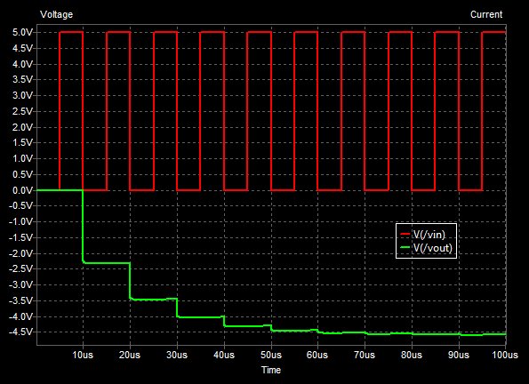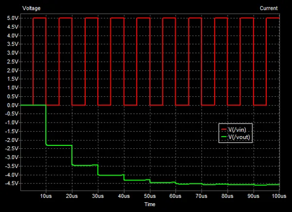 - The pulse then transitions back to 0V, and the cycle begins again with C1 charing back up to 5V (remember that it would of dropped to somewhere between 0-5V when transferring charge to C2 in the previous step).