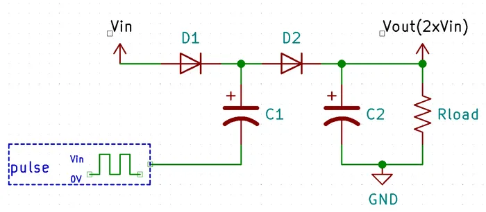 - Then the pulse in transitions from 0V to 5V. Because C1 is already charged to 4.7V, and this 5V appears on the capacitors negative lead, it “pushes” the top lead of C1 up to 9.7V. This then causes a current from C1, through D2, into C2, charging it up past 5V.