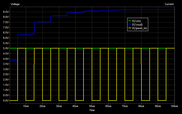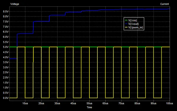 The below figure shows the behaviour of the voltage doubling charge pump. Notice that after about 5 cycles the output voltage stabilizes to it’s steady state value of approximately 8.7V. This simulation assumed a perfect voltage source driven pulse input, in reality the pulse input has some non-zero output impedance which effects the stabilization time and output current capacity.