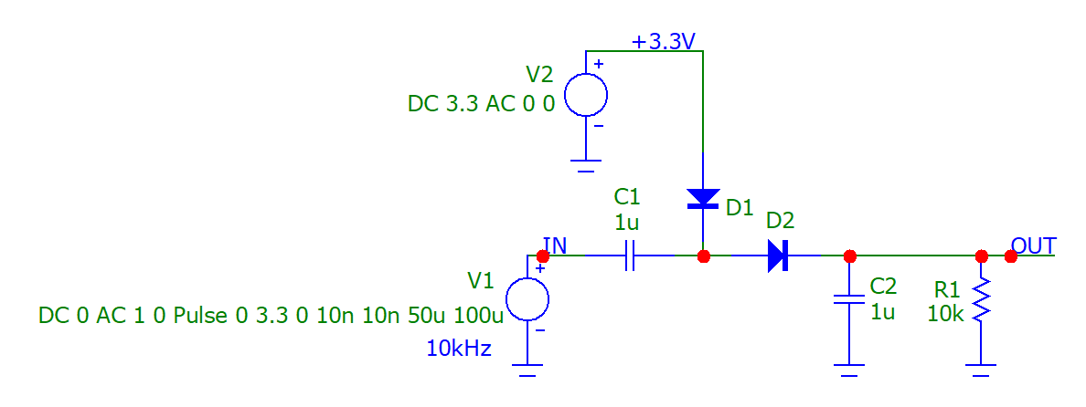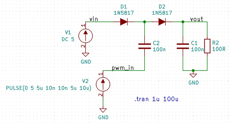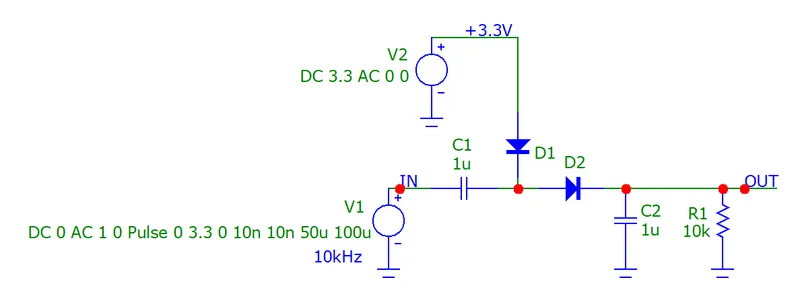 Let’s compare what this equation says compared to a simulation. Below is the schematic of a Micro-Cap +3.3V voltage-doubling charge pump simulation. The input is driven with a 10kHz +3.3V square wave.