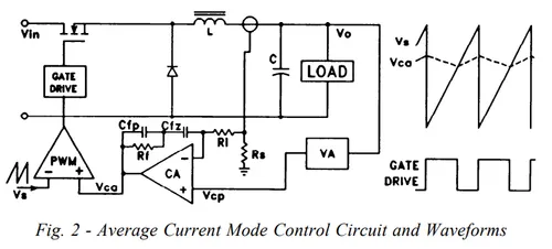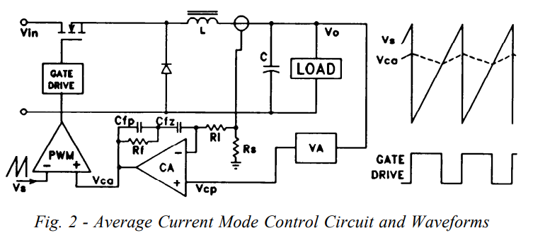 Average current mode control (as opposed to the more common peak mode control) is explained in depth in Unitrode’s Application Note “Average Current Mode Control of Switching Power Supplies” by Lloyd Dixon6.