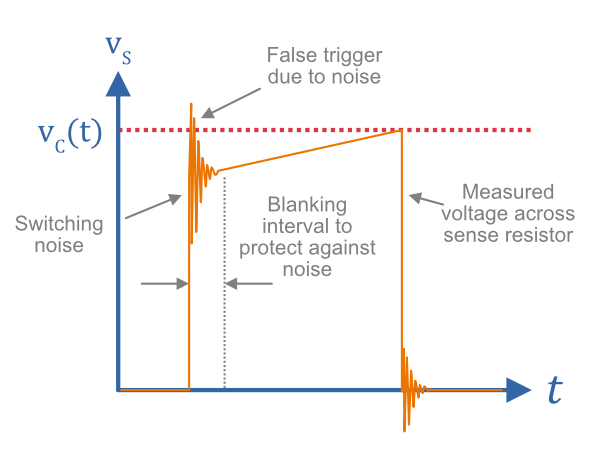 Because the switching action causes noise, and the current-measuring voltage signal is usually low (because low-valued resistors () are used to keep power dissipation down), current mode control has a high susceptibility to noise and voltage transients3 4. The switching action can cause ringing in the voltage measurement of the current at the point of turn on. This ringing can cause the measured signal to go over the control threshold and prematurely turn the switch OFF, as shown in the below diagram: