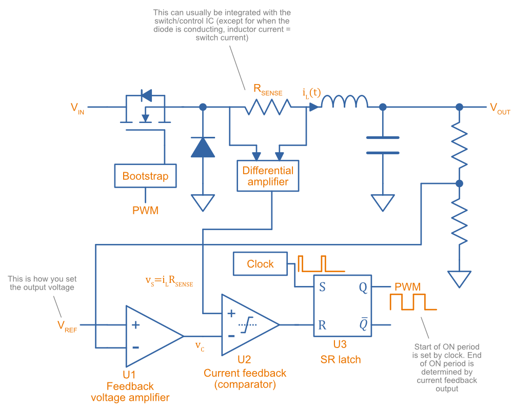 The following diagram shows the basic components of peak current mode control for a buck converter: