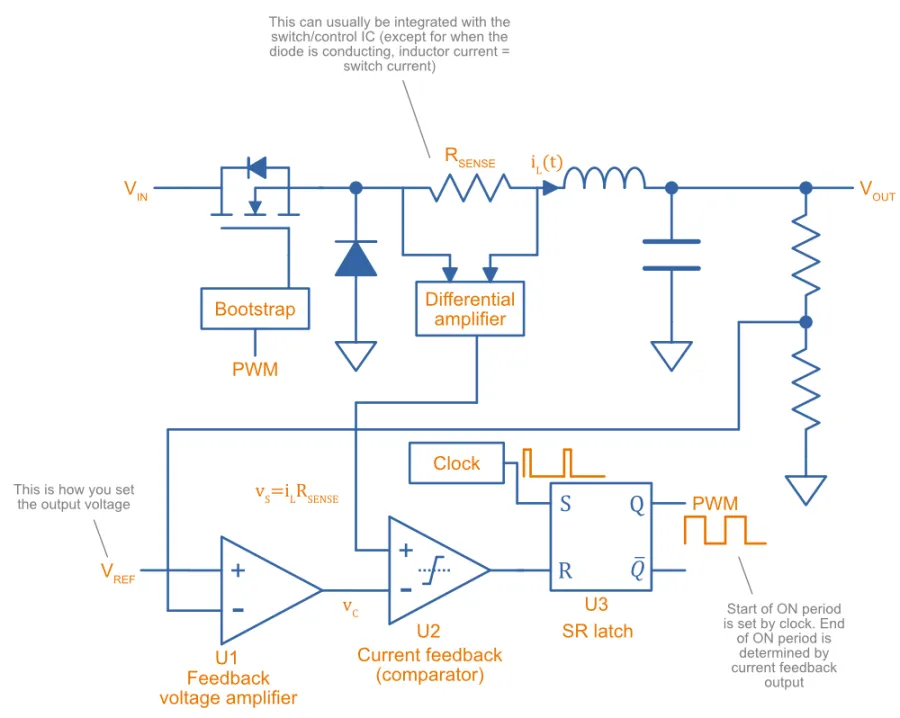 - The feedback voltage from the output resistor divider is compared to . The difference is amplified by the voltage feedback op-amp and fed into the comparator. This is compared with a voltage proportional to the inductor current.