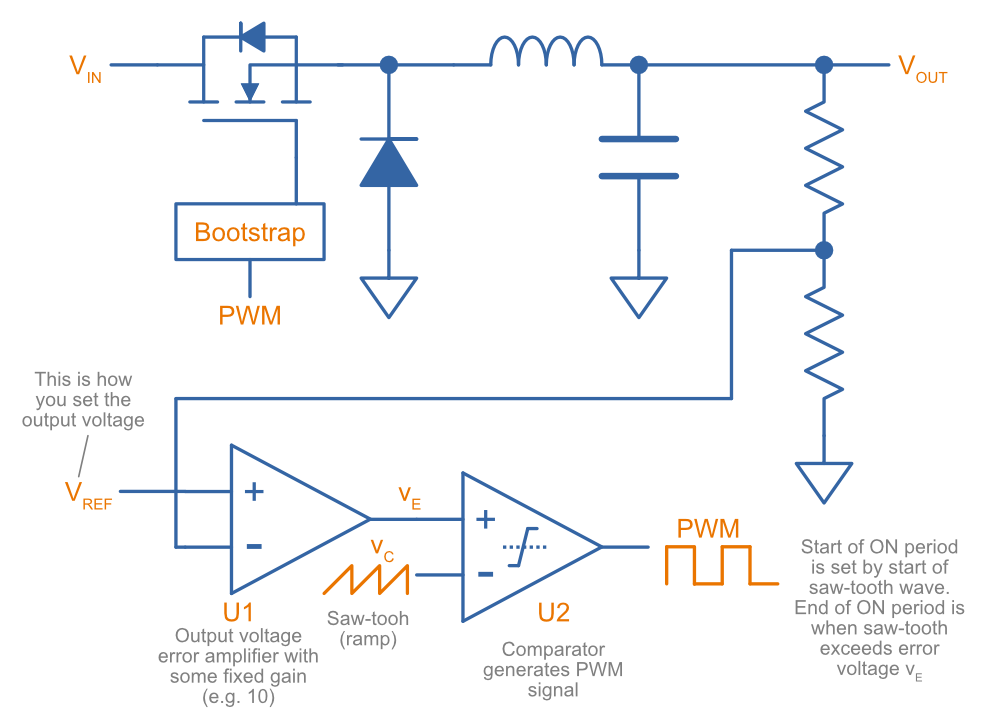 Switch-mode power supplies (SMPS) generally have to have some sort of feedback-based control loop to regulate the output to the desired voltage (or current). This is called the control methodology. There are a few important types of control methodologies that we will cover on this page.