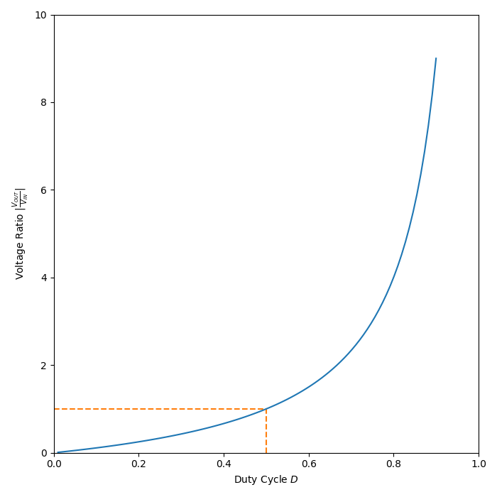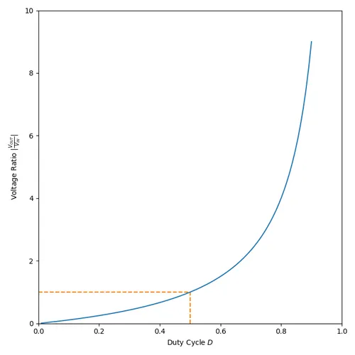 To give you an idea of how varying the duty cycle can produce either a higher or lower output voltage, see the below image which shows how the output voltage can vary from a small fraction of to many times larger than , and they are equal when the duty cycle is set at 50%.