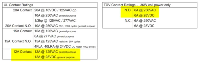 You might be wondering why a relay might be rated for a higher current with AC than at DC. Switching AC signals are gentler than DC signals on relays. This is because the voltage and current drops to zero twice per cycle in an AC signal. When you break an AC connection, the arc that forms is typically extinguished at the zero-crossing point. An arc in DC is harder to extinguish as the current flow is constant. This is a placeholder for the reference: fig-cit-j107f-relay-ul-and-tuv-contact-ratings-with-ac-dc-differences-highlighted shows an example of this with the CIT J107F family of relays.