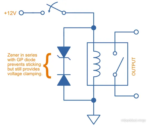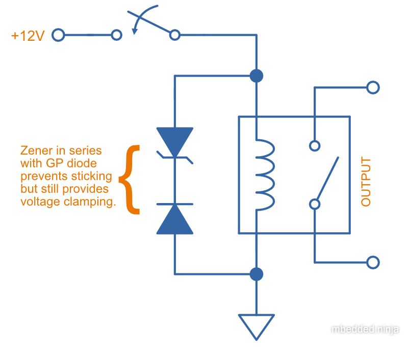 However, there are some drawbacks to using basic flyback diodes. On relay switch-off, the flyback diode decays the magnetic field of the coil far more slowly than if there was no flyback diode protection present. This causes the relay to take longer for the “clapper type” relay contacts to open. When relay contacts open, small “microwelds” occurs at the contact interface. Usually, the contacts are moving apart with enough force/velocity that these welds are easily broken. However, the slower open time with a flyback diode can cause the relay to “stick” — this is when the contacts become welded together and do not open43.