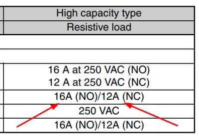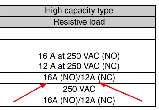There can also be a different in current rating for a relay which has normally-open and normally-closed contacts. This is due to the contact pressure difference when the contacts are closed. For a normally-open contact, the contacts are held closed by the magnetic force of the relay coil. For a normally-closed contact, the contacts are only held closed by the spring. The force from the coil is much stronger than the spring, as this directly impacts the contact resistance. The contacts held closed by the coil have a lower contact resistance, and can therefore handle more current. This is a placeholder for the reference: fig-omron-g5le-relay-no-vs-nc-current-difference shows an example of this with the Omron G5LE relay family.6