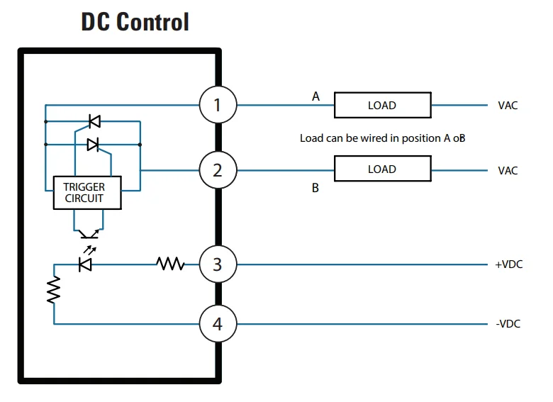This is a placeholder for the reference: fig-sensata-spf240d25-internal-wiring-diagram shows the internal wiring diagram. Just like normal SSRs, it uses an opto-coupler (LED and phototransistor) to communicate the control signal to the switching circuitry across the isolation barrier. However, rather the the light directly going to the gates of back-to-back MOSFETs, it goes to control circuitry which implements the zero crossing detection and then controls the SCRs.