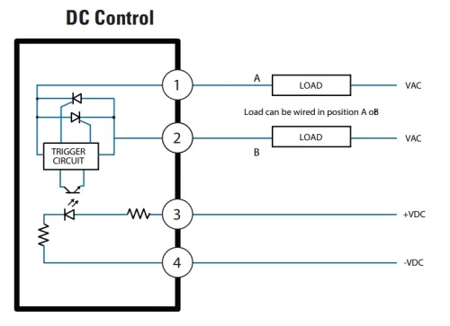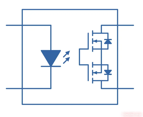 Below is the typical schematic symbol for a solid-state relay. It shows the inputs feeding the opto-coupler and the back-to-back MOSFETs that do the switching on the output: