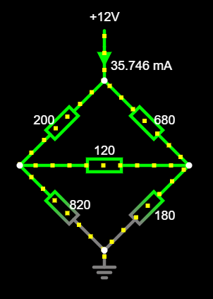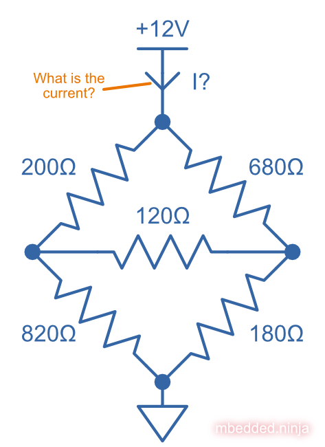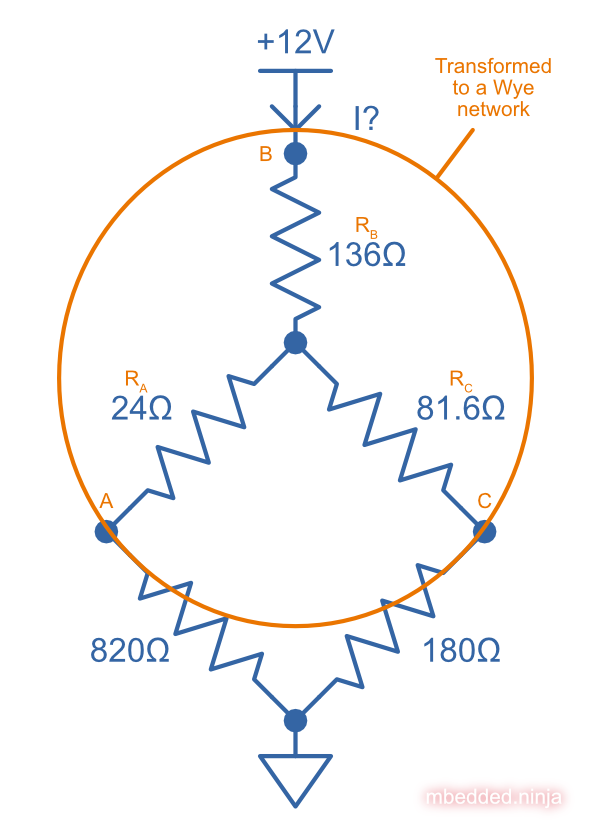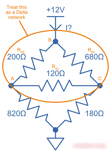 What is the current I drawn from the +12V for this resistor network? This can’t be solved purely with resistors-in-series and resistors-in-parallel equations, but can be done with the help of a Delta To Wye transformation.