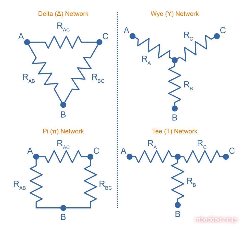 Schematic showing the four common resistor network arrangements: Wye, Delta, Pi and Tee.