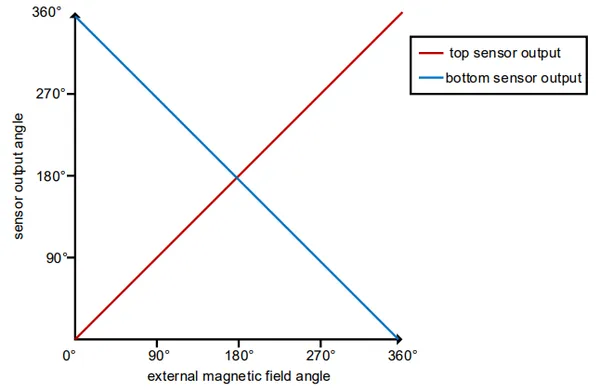 The TLE5014 has variants with fully redundant dual sensors for safety critical applications. To further aide with fault detection, the magnetic sensors are flipped w.r.t. to each other to create inverted outputs, as shown below.