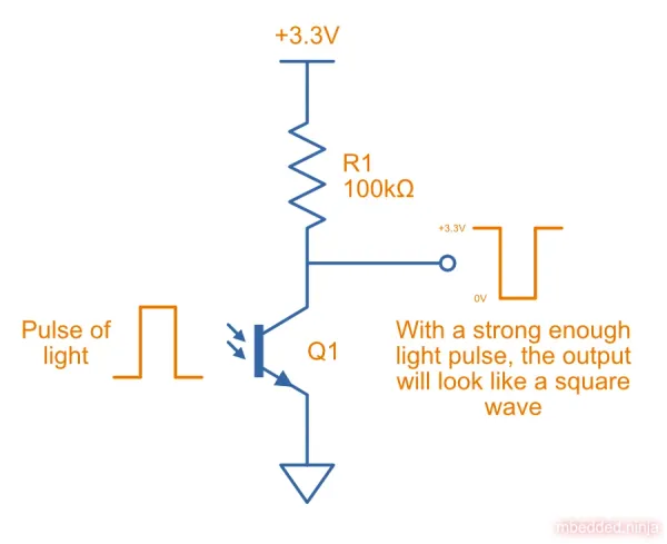 One of the most basic phototransistor circuits can be made simply with a phototransistor and a resistor, as shown in This is a placeholder for the reference: basic-phototransistor-circuit. Under no or low light conditions, the phototransistor is off (save for the dark current) and the output will be pulled high by resistor . When light shines on the phototransistor, it turns on and the output will be pulled to ground by the phototransistor. With a strong enough light source, the phototransistor will saturate and the output voltage will look like a square wave. This is useful for digital circuits (i.e. you can feed this pin directly into a microcontroller GPIO and read it digitally).