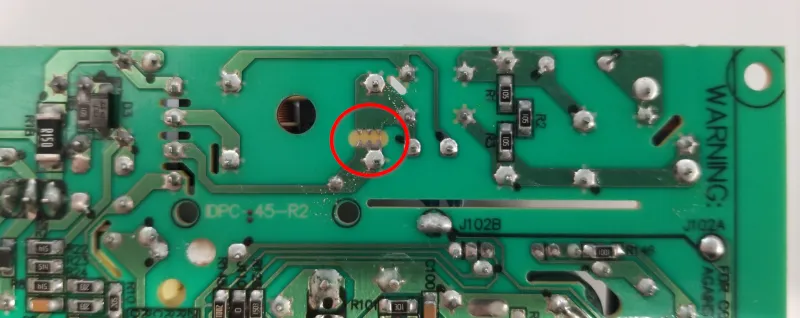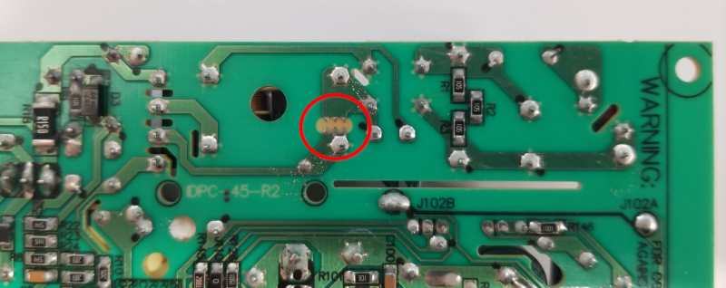 A PCB copper based spark gap on the underside of a Mean Well IDPC-45-350 constant-current LED driver.
