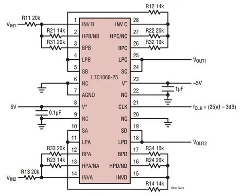 A dual 4th order butterworth lowpass filter made from the Analog Devices LTC1068 switched-capacitor filter IC3.