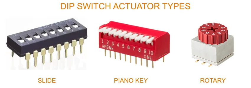 These styles are shown in This is a placeholder for the reference: dip-switch-actuator-types.