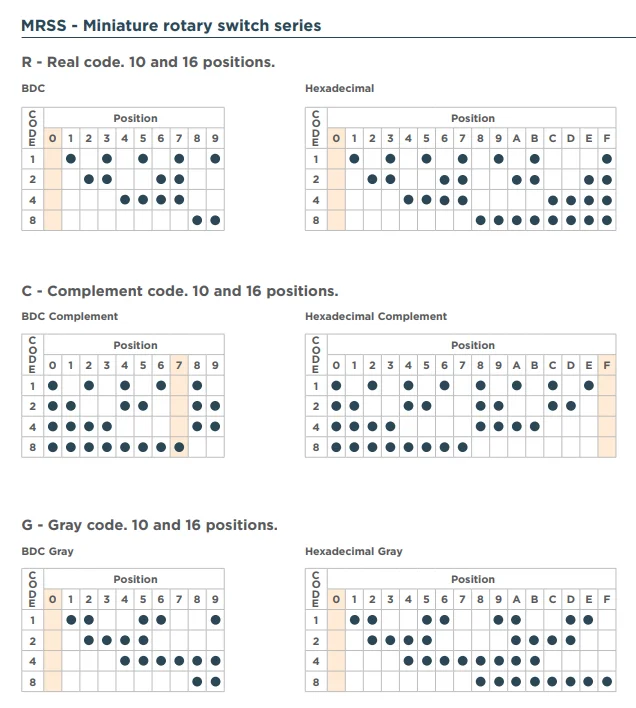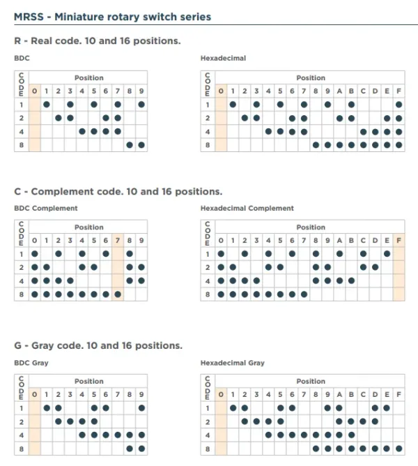 - Gray code: Follow the Gray code sequence (a.k.a. reflected binary code or RBC6) and ensures that only one bit changes at a time. Gray coding is useful for preventing momentary spurious outputs when changing positions.