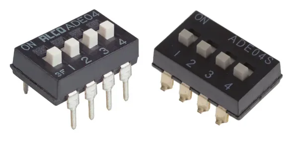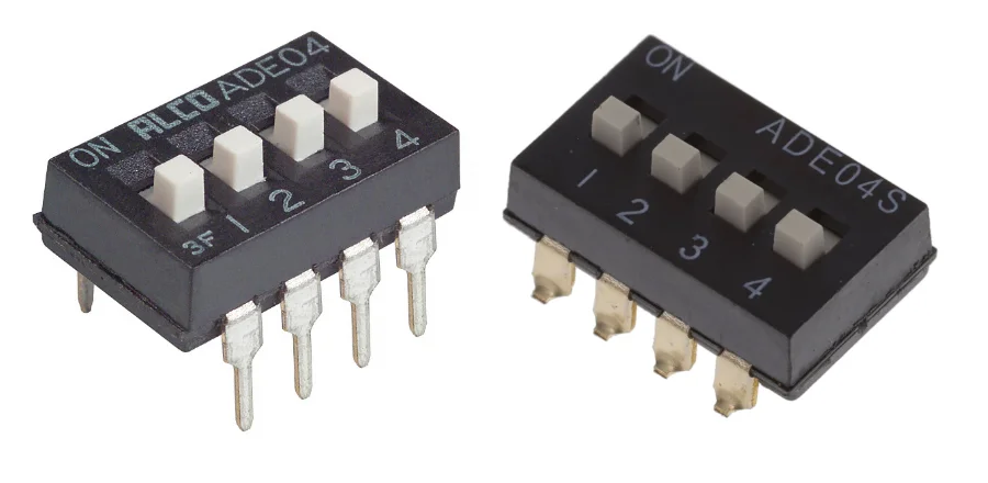 DIP switches are a group of mechanical switches that are grouped together in a single DIP package. The older versions where through-hole and used the DIP package and thus the DIP name, however these days you can also purchase SMD versions (the “DIP switch” name is still used). This is a placeholder for the reference: th-and-smd-4-pos-dip-switches shows examples of standard through-hole and SMD DIP switches.