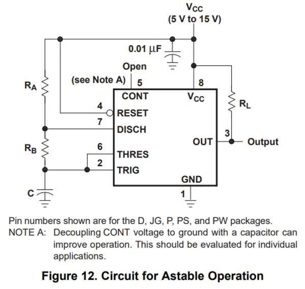 Astable mode is when the 555 timer is configured to output a continuous waveform with a fixed frequency and duty cycle. It is similar to monostable mode, except that it continually resets itself after every pulse.