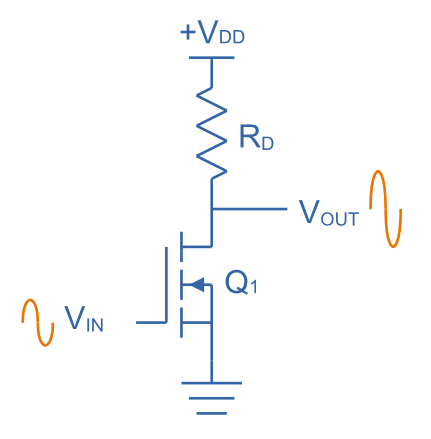 A common-source enhancement-mode MOSFET amplifier is a basic MOSFET-based amplifier. The most popular variant is based of an N-channel enhancement-mode MOSFET (although you can make common-source amplifiers with P-channels too!), in which the source is grounded. It is called a “common-source” amplifier because the source is a shared (common) terminal between the input and output. It is closely related to the BJT common-emitter amplifier. Like the common-emitter amplifier, it is an inverting amplifier.