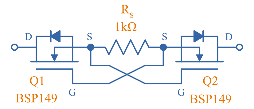 An interesting use for depletion-mode MOSFETs is a simple bi-directional current limiter circuit. The below image shows the schematic, which uses two depletion-mode MOSFETs connected back-to-back with a resistor in-between.