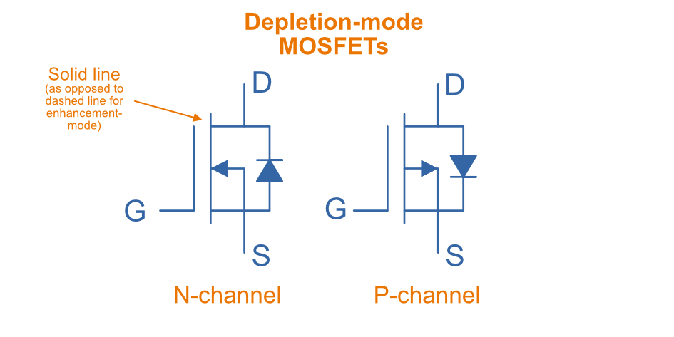Although not as popular as enhancement-mode MOSFETs, depletion-mode MOSFETs are a very important MOSFET type. They are typically distinguished on schematics from enhancement-mode types by drawing a solid line rather than a dashed line for the channel, as shown below: