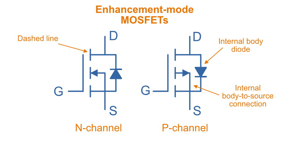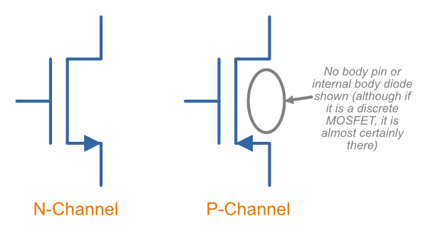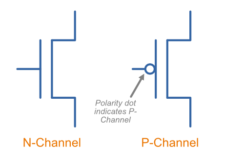 Unfortunately for the keen circuit designer learning about MOSFETs, there is a dizzying variety of MOSFET symbols in use, owing to the fact that there are a larger number of different MOSFET types, and that no one can agree on a single standard. This section will walk you through all the various types. The below image shows the commonly used schematic symbols for enhancement-mode MOSFETs, with both the N-channel and P-channel variant.