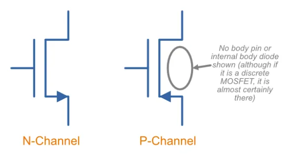 Sometimes the body connection, body diode and enhancement/depletion mode indicators are removed altogether from the schematic symbol, and a simplified set of symbols is used as shown below: