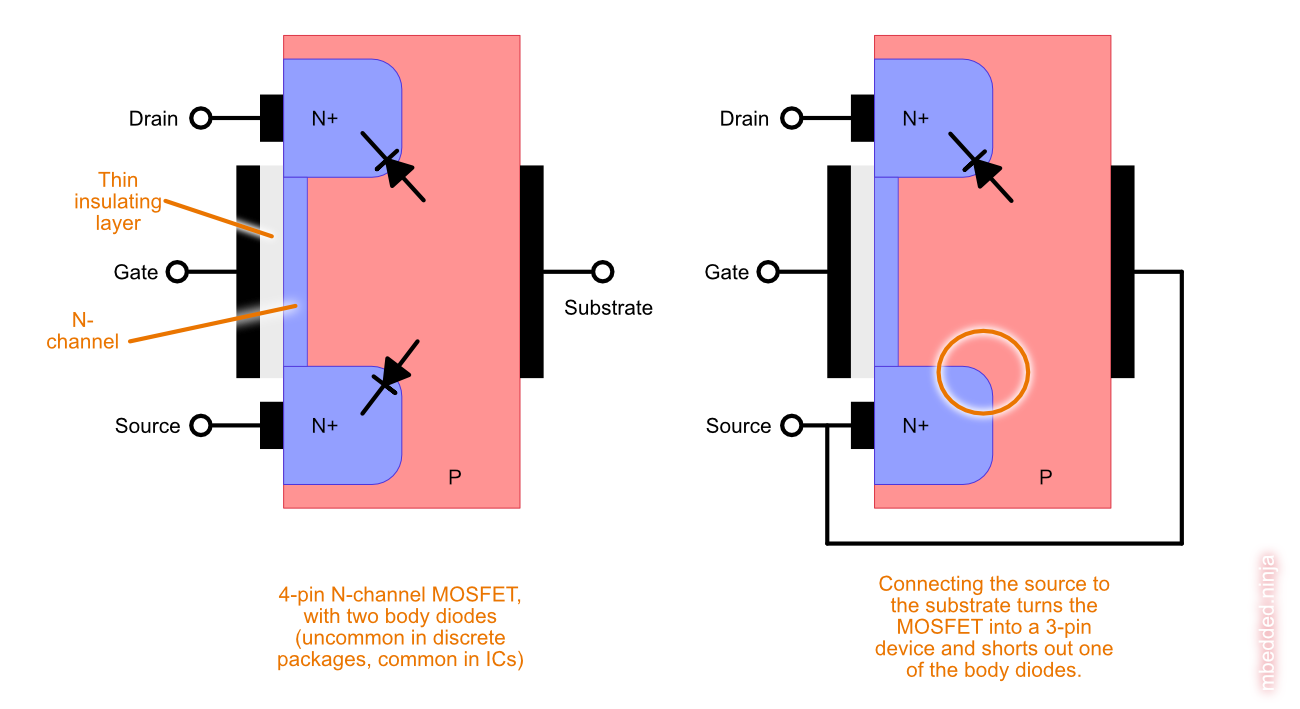 Another interesting note is that without the connection of the substrate to the source, the MOSFET source and drain connections would be identical, and there would be no need to separately identify them. As soon as the substrate is connected to the source, the MOSFETs internals become asymmetrical and you cannot freely swap around the drain and the source (if you do swap them, you’ll normally get the body diode conducting when you don’t want it to!).