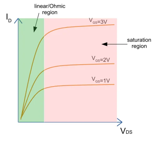 The above examples describing switching a MOSFET from it’s fully off state to it’s fully on state. But if you apply a at or just above , the MOSFET will only partially turn on. The below image illustrates a MOSFETs behaviour: