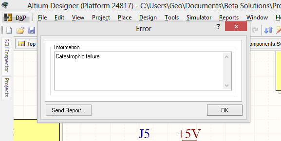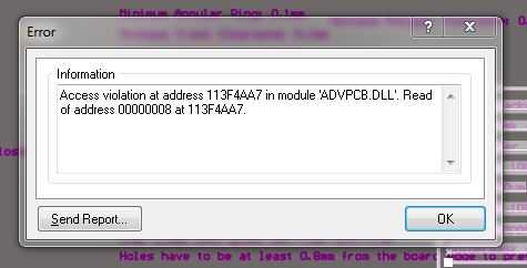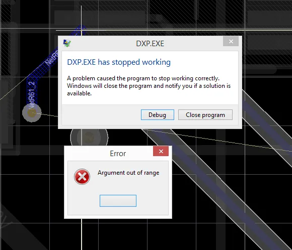 I have got fatal “Argument out of range” errors while performing basic routing tasks on the PCB. There is no way to save any work when this occurs, and after clicking the “O.K.” button of the many “Argument out or range” boxes that pop-up (which are glitchy), Altium crashes and closes automatically.