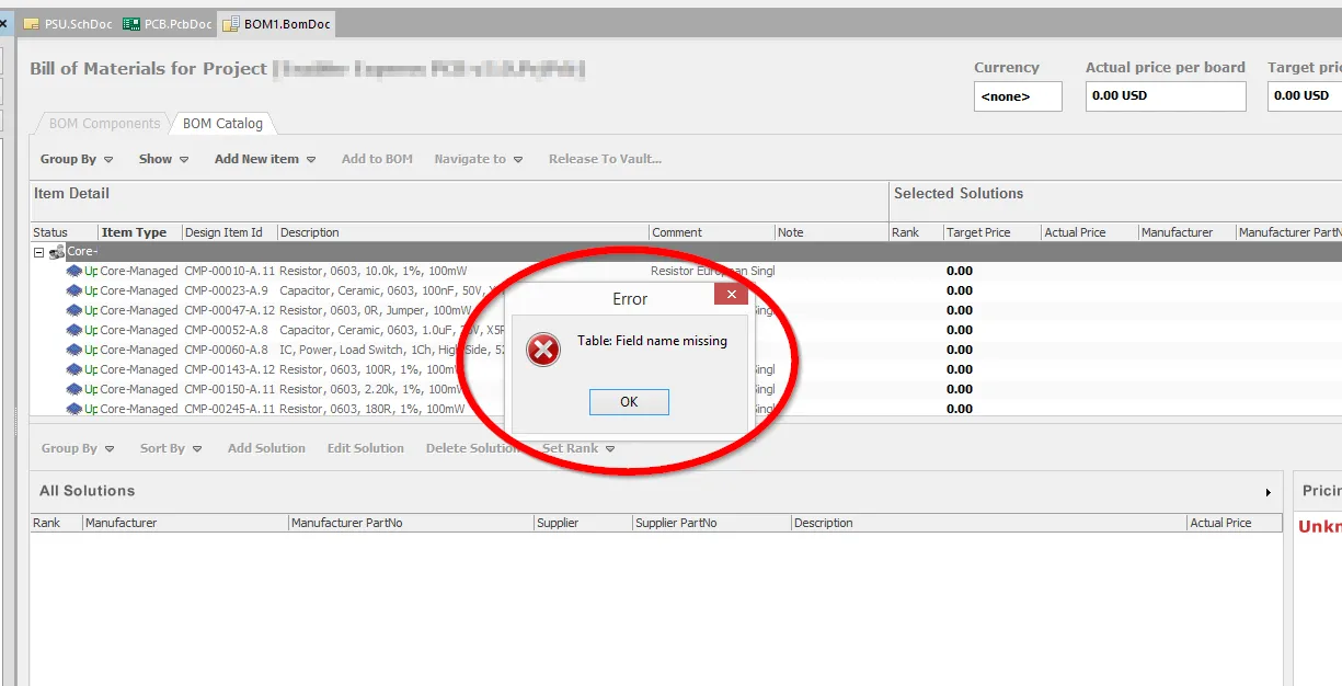 If you get the error “Table: Field name Missing” when opening, modifying, or saving a BOM (for me it occurs when using a .BomDoc), it is usually because your Altium project contains components which have parameters with no name.