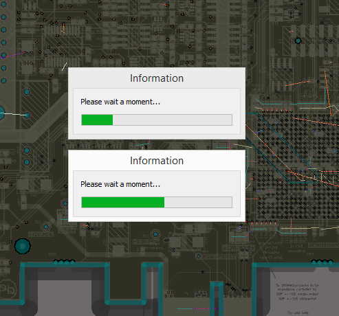 Altium crashing with a ‘Information’ title box that says ‘Please wait a moment’, and a forever scrolling progress bar. At the point, save as much work as possible (you can still operate some commands at this point), and quit.