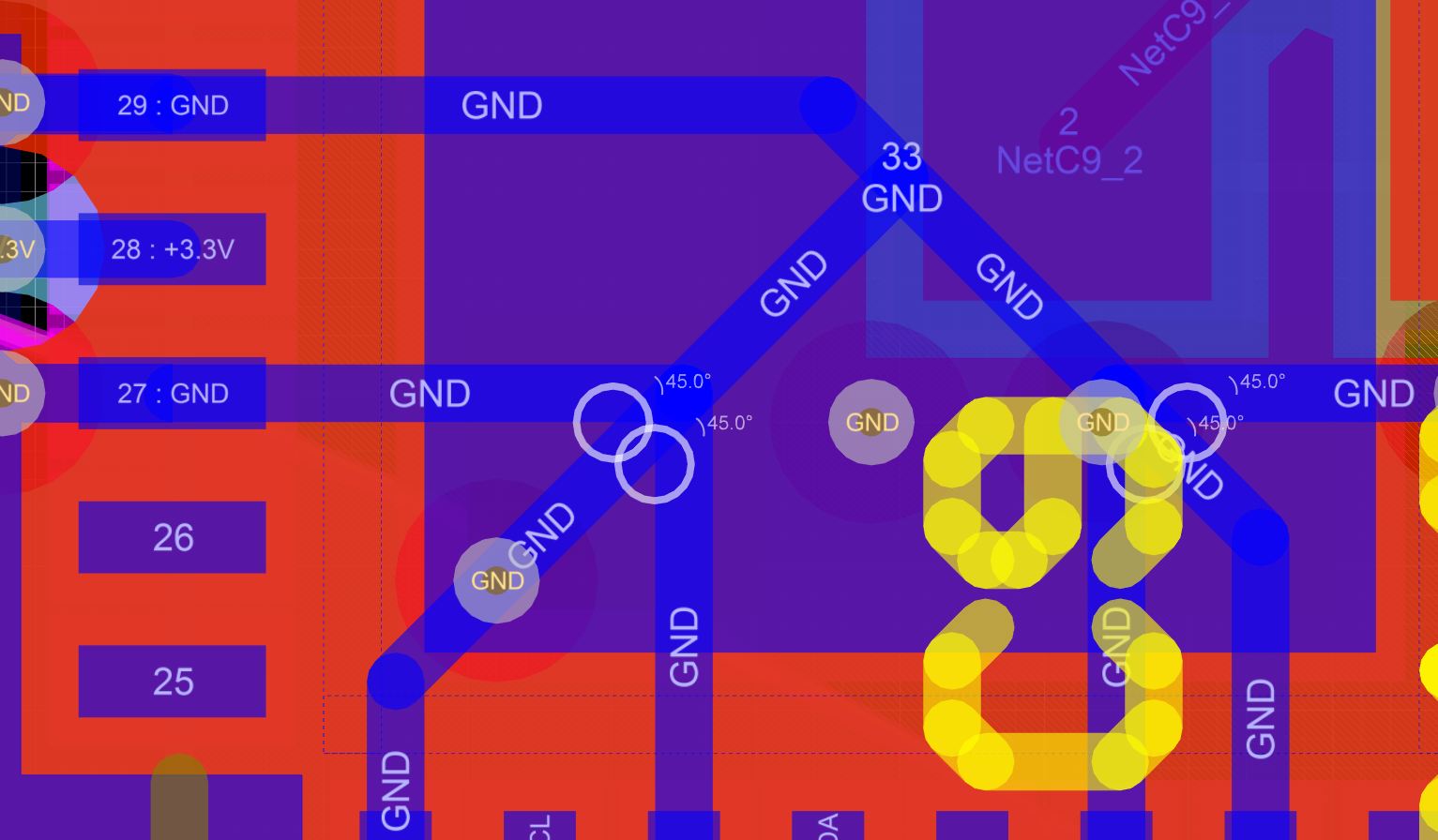Altium will give you warnings about acute angles when the tracks are inside pads (and therefore don’t actually get drawn). This normally occurs in the central pad of SMD IC packages (such as QFN). The solution to this finish tracks just as they enter pads rather then letting them snap to the centre of the pad. To do this, hold down CTRL while routing the track, this will stop it from snapping to the centre.