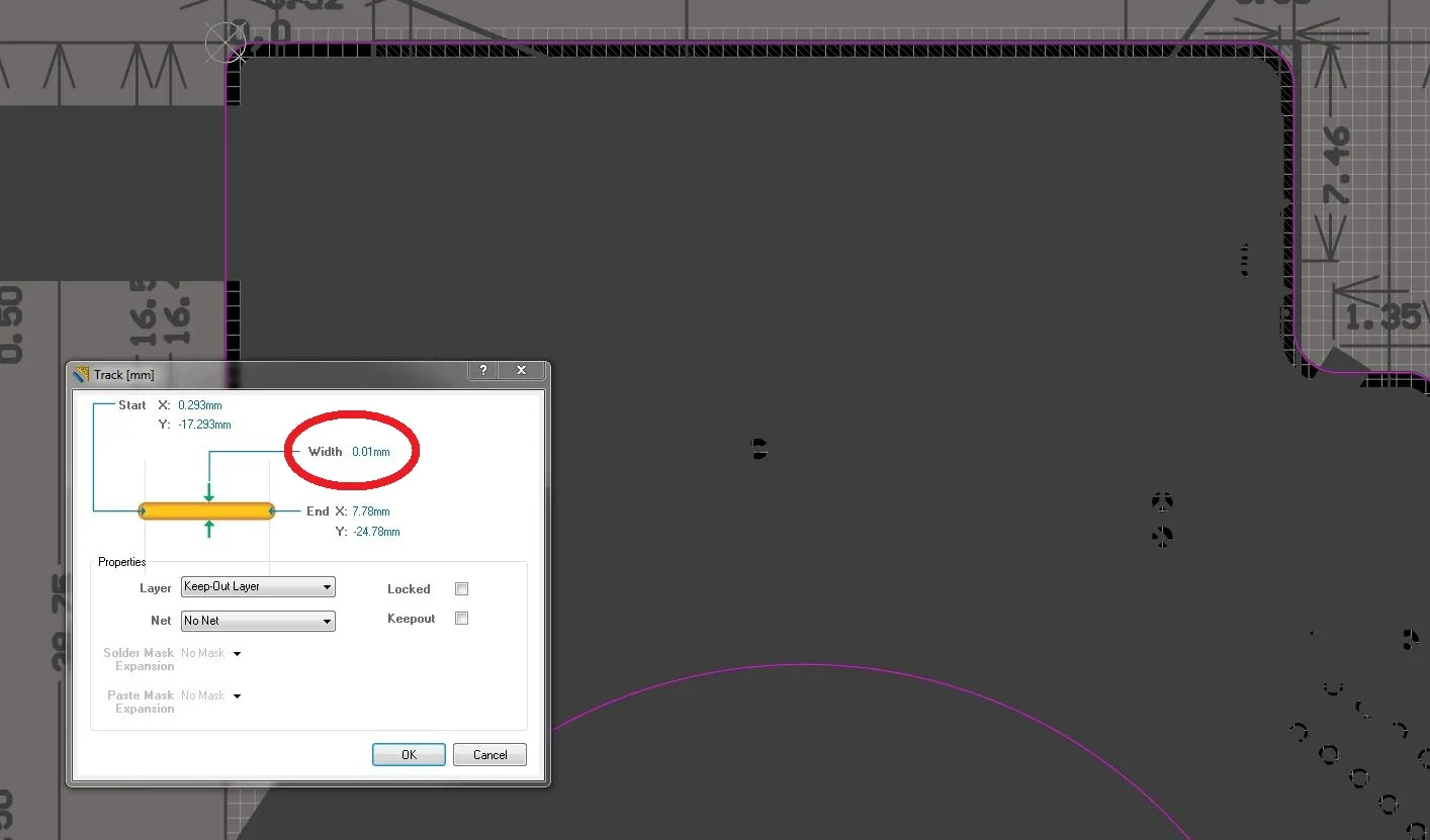 If you are finding that when you draw polygons that Altium is not staying the correct distance away from zones you draw on the keep-out layer, you are probably caught by one of Altium’s ‘gotchas’. When deciding the clearance between a track on the keep-out layer and any polygon (or any other object for that matter), it calculated from the EDGE of the track, not the centre. When you think about it, this makes sense, since this is the behaviour you would expect if drawing solid objects on the keep-out layer as fills. However, it can be quite annoying when using tracks.