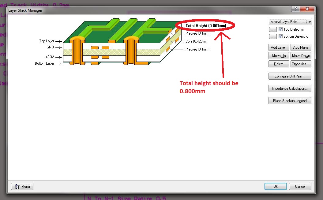 The layer stack manager seems to incorrectly calculate the stack-up height by 1um (O.K., it’s not that important, but still…). See the screen shot below for an example. All the copper thicknesses are 35um. It should total to 0.800mm, but Altium incorrectly reports it as 0.8001mm.