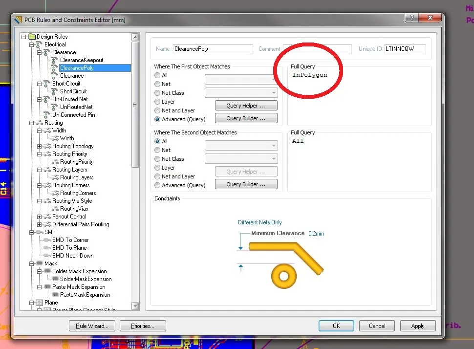 When setting the clearance rule in Altium. make sure that when you set the ‘First Object Matches’ query, you use the term ‘InPolygon’ rather than ‘IsPolygon’. This is because Altium treats all the copper which you wish to apply the clearance rule to in the polygon as an object which is ‘in’ the polygon object. See the example in the picture below.