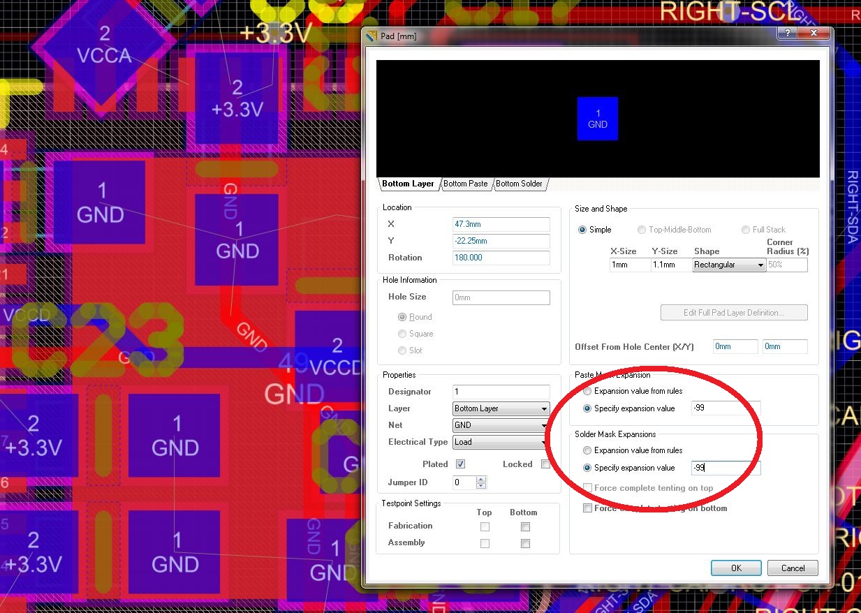 To remove soldermask/solder paste from pads, the only way to do it is to go into the pads properties (double-click it), and then change the “Soldermask Expansions” (or Paste Mask…) option from “Expansion value from rules” to “Specify expansion value”. Then you have to set it to a negative value large enough the it will shrink it away to nothing (e.g. larger than than the radius of the hole/via itself). I normally just enter -99mm or something along those lines…