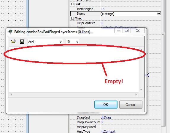 The combo boxes in the script form designer forget their items if you set them using the GUI, save, and then restart. The way to get around this is to add the items at run time in the code itself (using the function comboBox.AddItem).