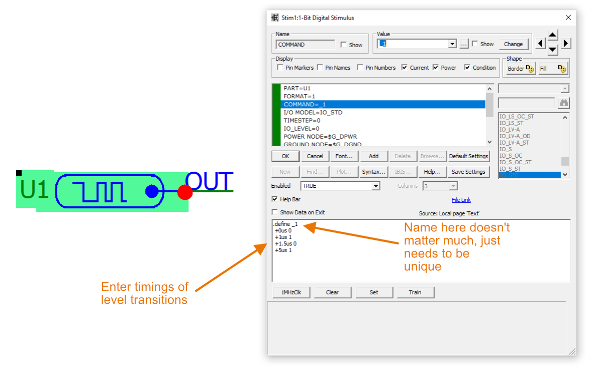 Once you have placed a Digital Stimulus on your circuit, you configure it by double-clicking it and then enter in logic level transitions in the large text box. Example syntax is shown in the image below: